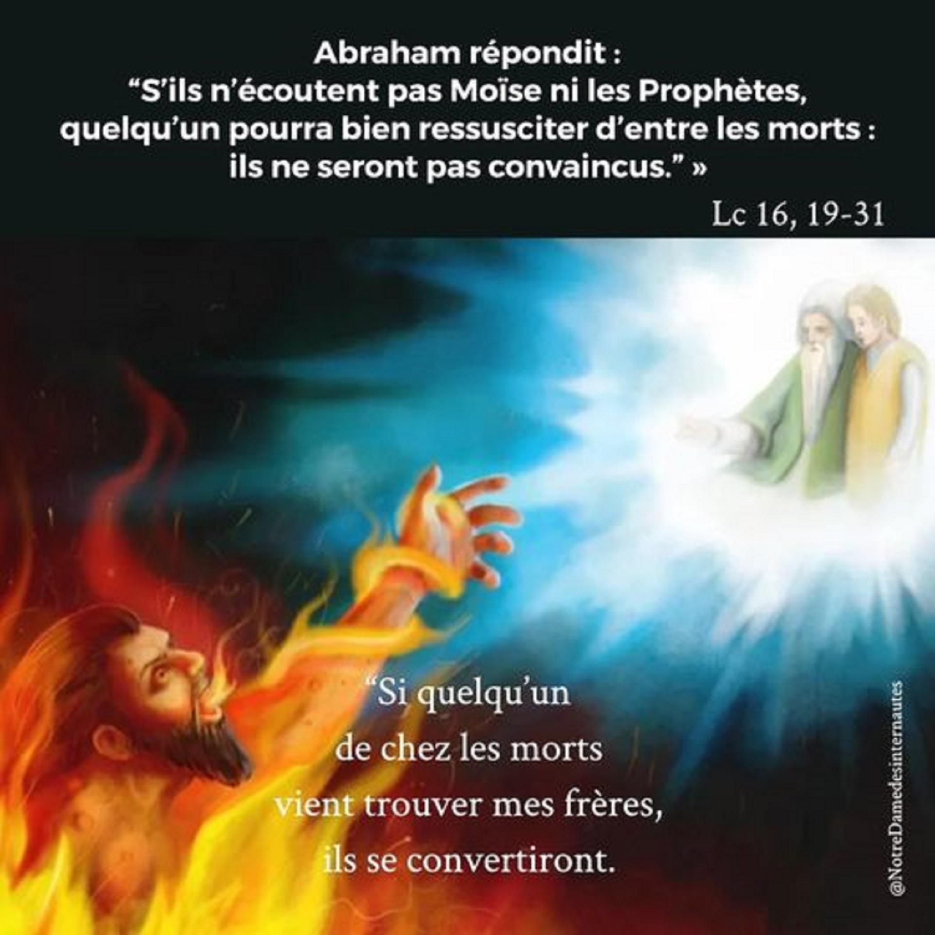 Abraham répondit : “S’ils n’écoutent pas Moïse ni les Prophètes, quelqu’un pourra bien ressusciter d’entre les morts : ils ne seront pas convaincus.” »
